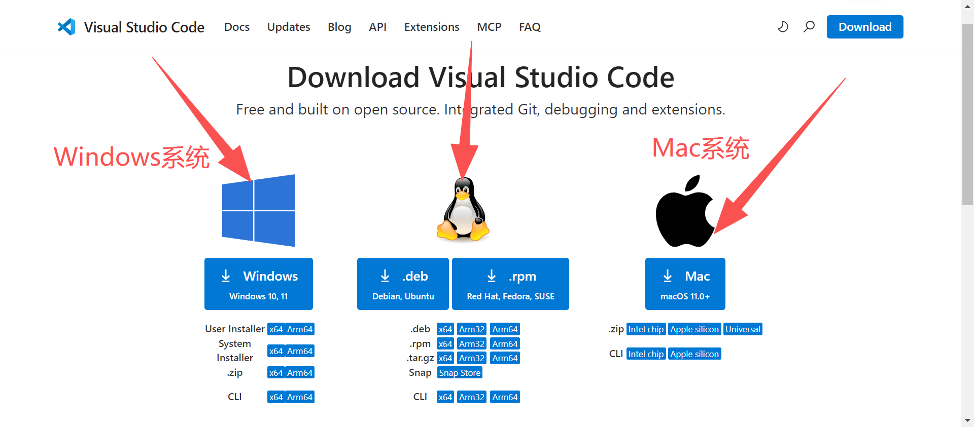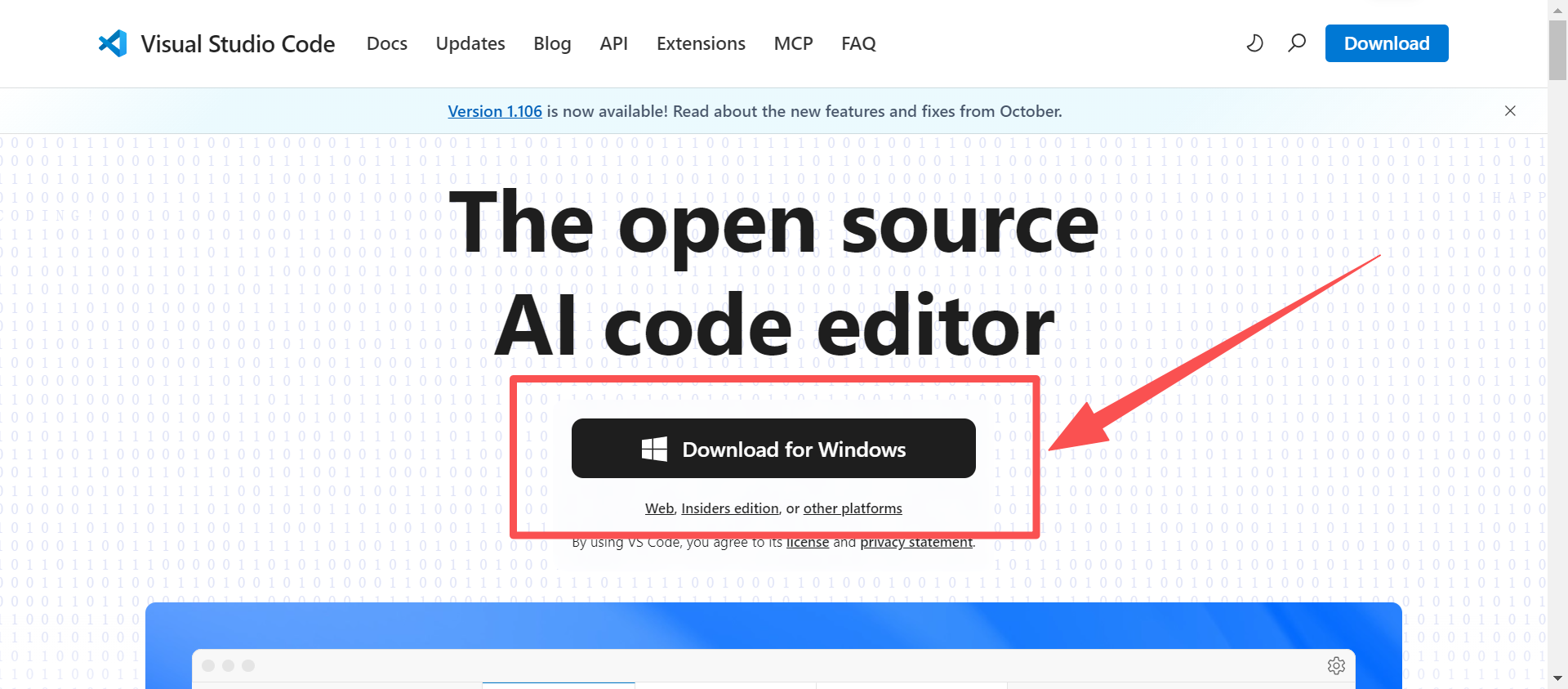 1、先官方网址:https://code.visualstudio.com/,选择“Download for Windows”(针对Windows系统)