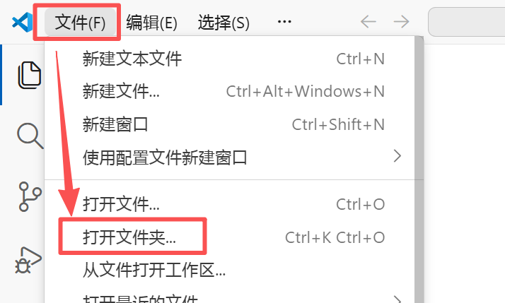 2、打开 Visual Studio Code工具,选择菜单“文件”下的“打开文件夹”,然后找到刚刚创建的文件夹。
