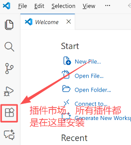 当你运行之后,你会发现 Visual Studio Code工具 界面是英文,这对于英语不好的同学,比较费劲,为此,Visual Studio Code工具为各位开发者提供良好的软件插件市场。具体如图: