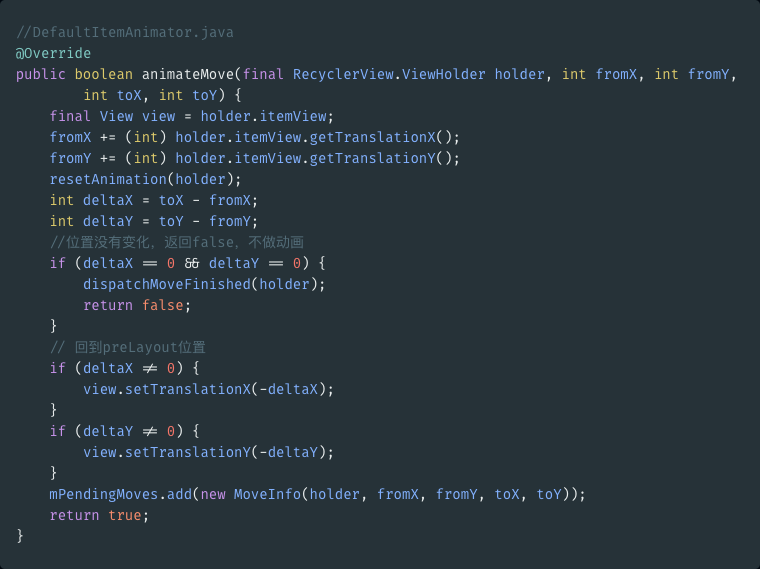 - 将MoveInfo保存到mPendingMoves中,以便RecyclerView#postAnimationRunner()使用