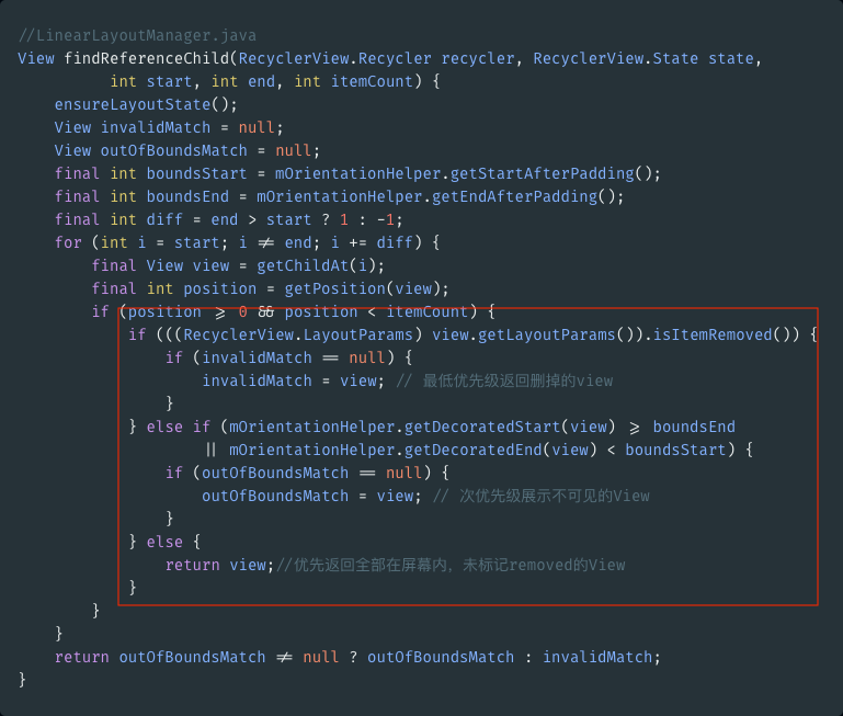 - 优先返回全部在屏幕内,未标记removed的View;