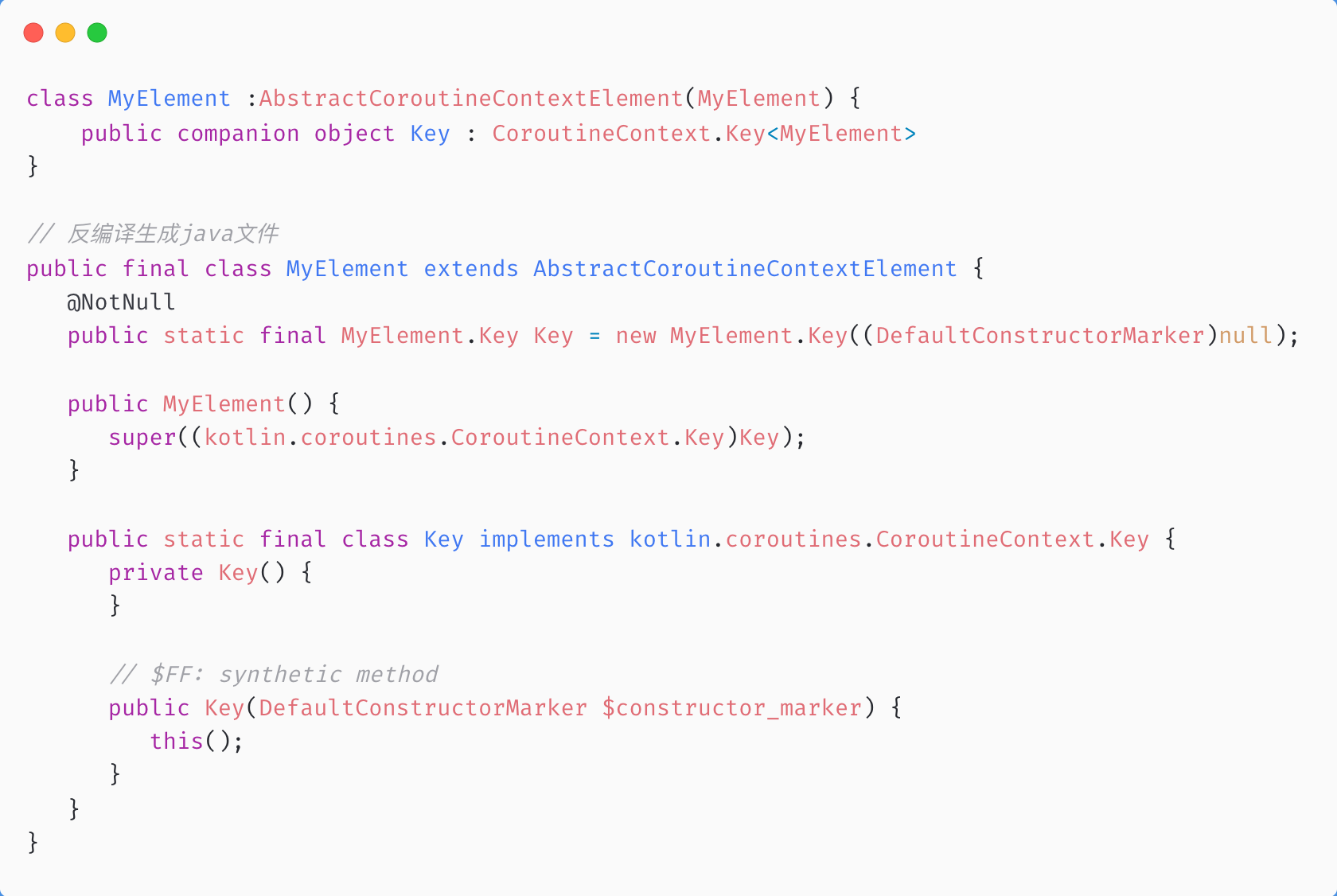 通过观察协程官方库中的例子,我们发现Element的子类都必须重写Key这个属性,而且Key的泛型类型必须和类名相同。以CoroutineName为例,Key是一个伴生对象,同时Key的泛型类型也是CoroutineName。