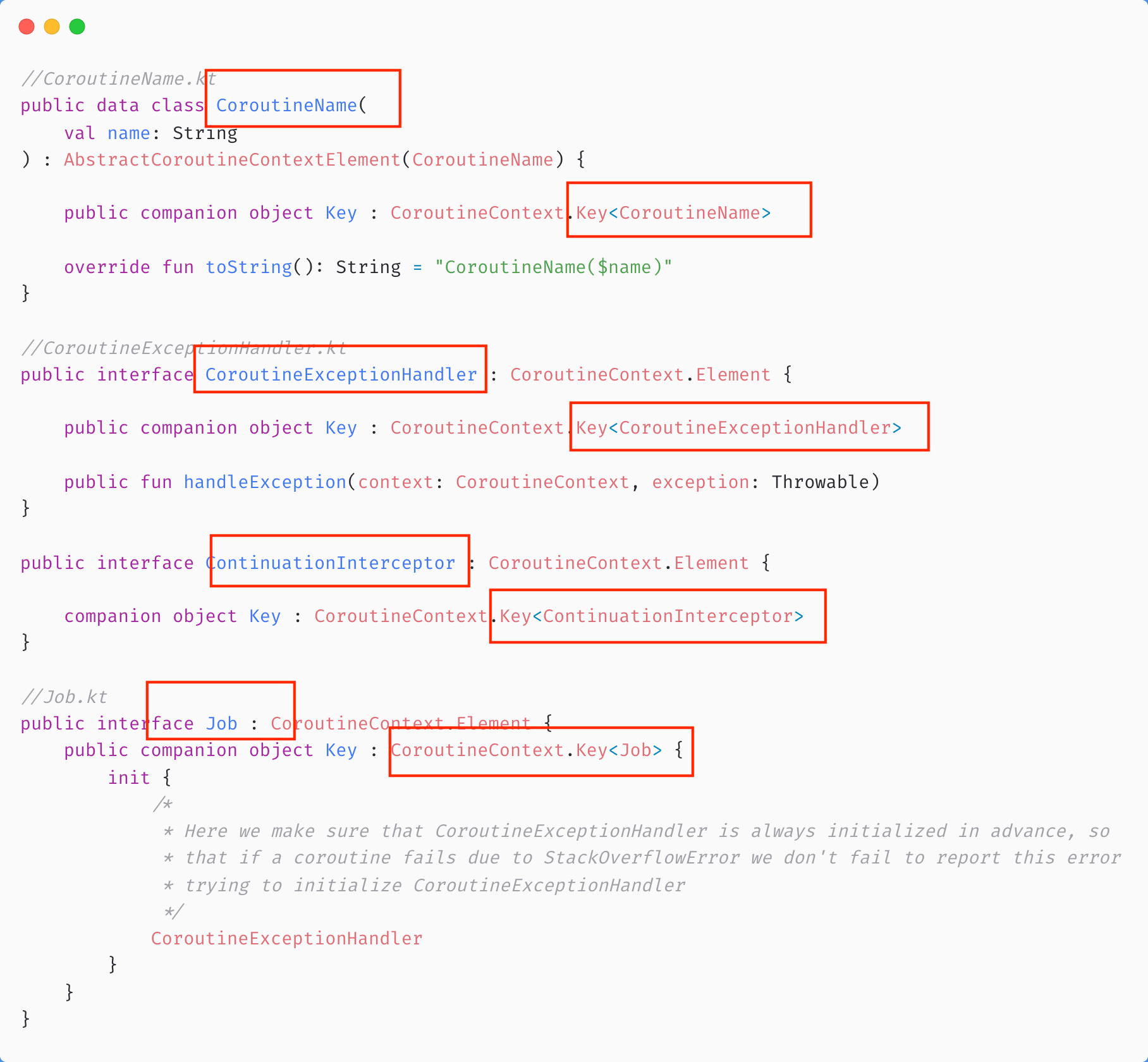 Key是一个接口定义在CoroutineContext中的一个接口,作为接口它没有声明任何的方法,那么其实它没有任何真正有用的意义,它只是用来检索。我们先来看下,协程库中是如何使用Key接口的。