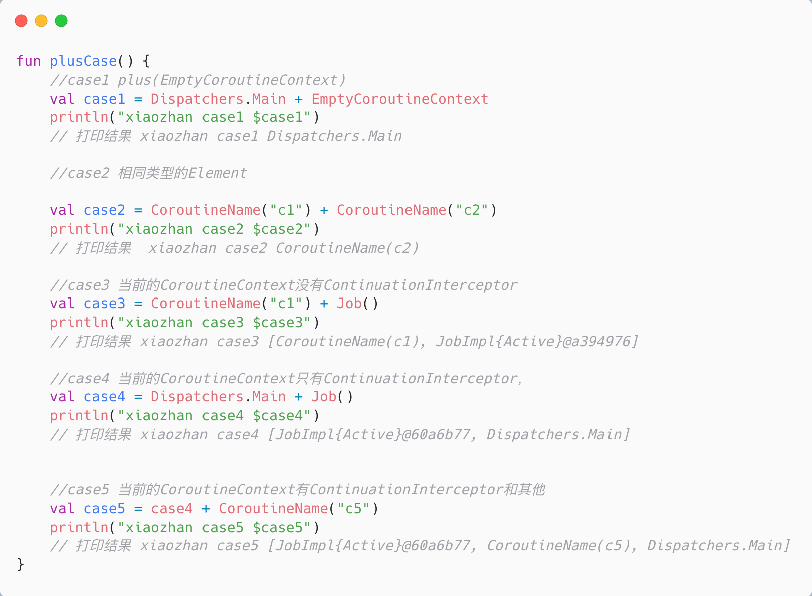 Dispatchers.Main + EmptyCoroutineContext结果:Dispatchers.Main。CoroutineName("c1") + CoroutineName("c2")结果:CoroutineName("c2")。相同类型的直接替换掉。CoroutineName("c1") + Job()结果:CoroutineName("c1") <- Job。头插法被plus的(Job)放在链表头部Dispatchers.Main + Job()结果:Job <- Dispatchers.Main。虽然是头插法,但是ContinuationInterceptor必须在链表头部。Dispatchers.Main + Job() + CoroutineName("c5")结果:Job <- CoroutineName("c5") <- Dispatchers.Main。Dispatchers.Main在链表头部,其它的采用头插法。