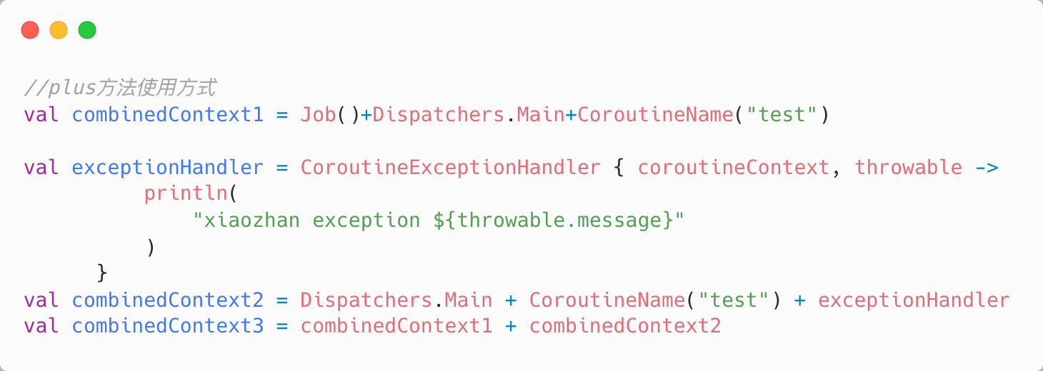 其实+操作符就是把两个CoroutineContext合并成一个链表,后文会详细讲解