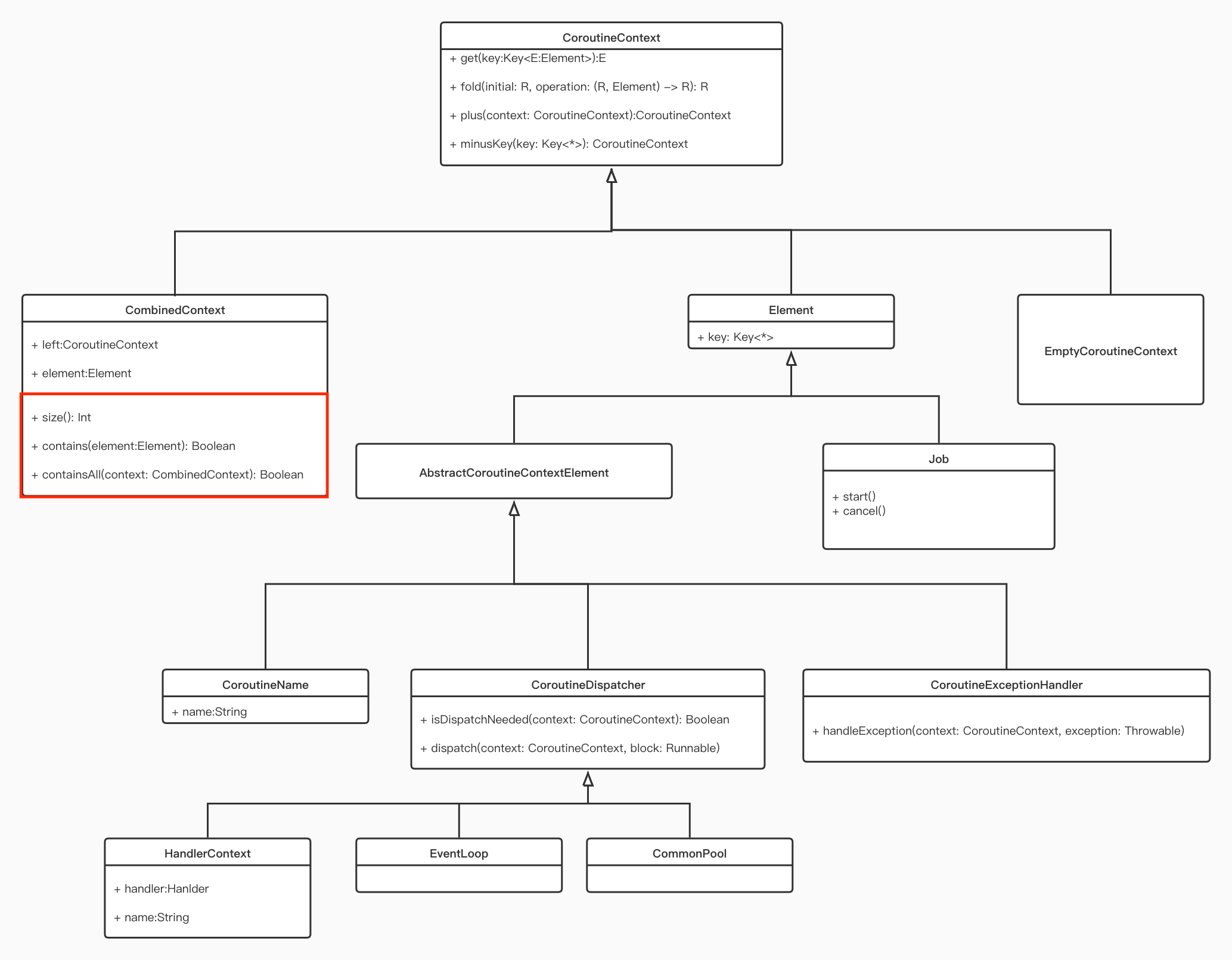 图中红框处,CombinedContext定义了size()和contains()方法,这与集合操作很像,CombinedContext是CoroutineContext对象的集合,而Element和EmptyCoroutineContext却没有定义这些方法,真正实现了集合操作的协程上下文只有CombinedContext,后文会详细讲解