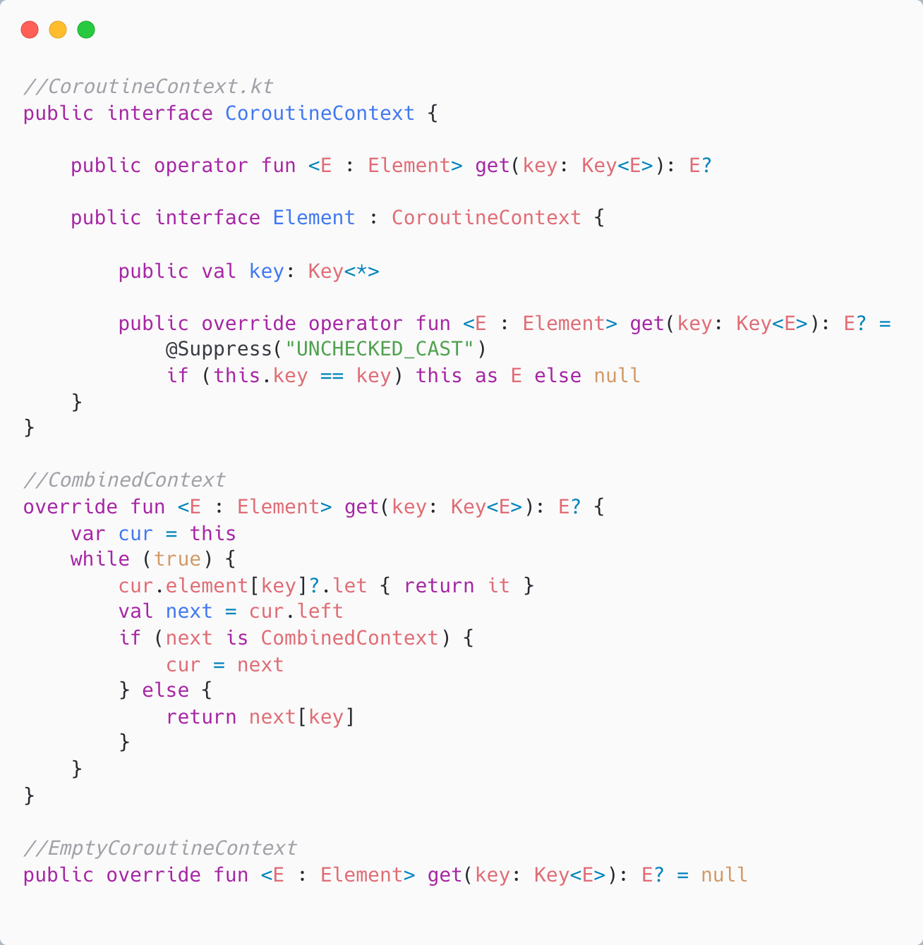 - CoroutineContext是element的set集合,没有重复类型的element对象。