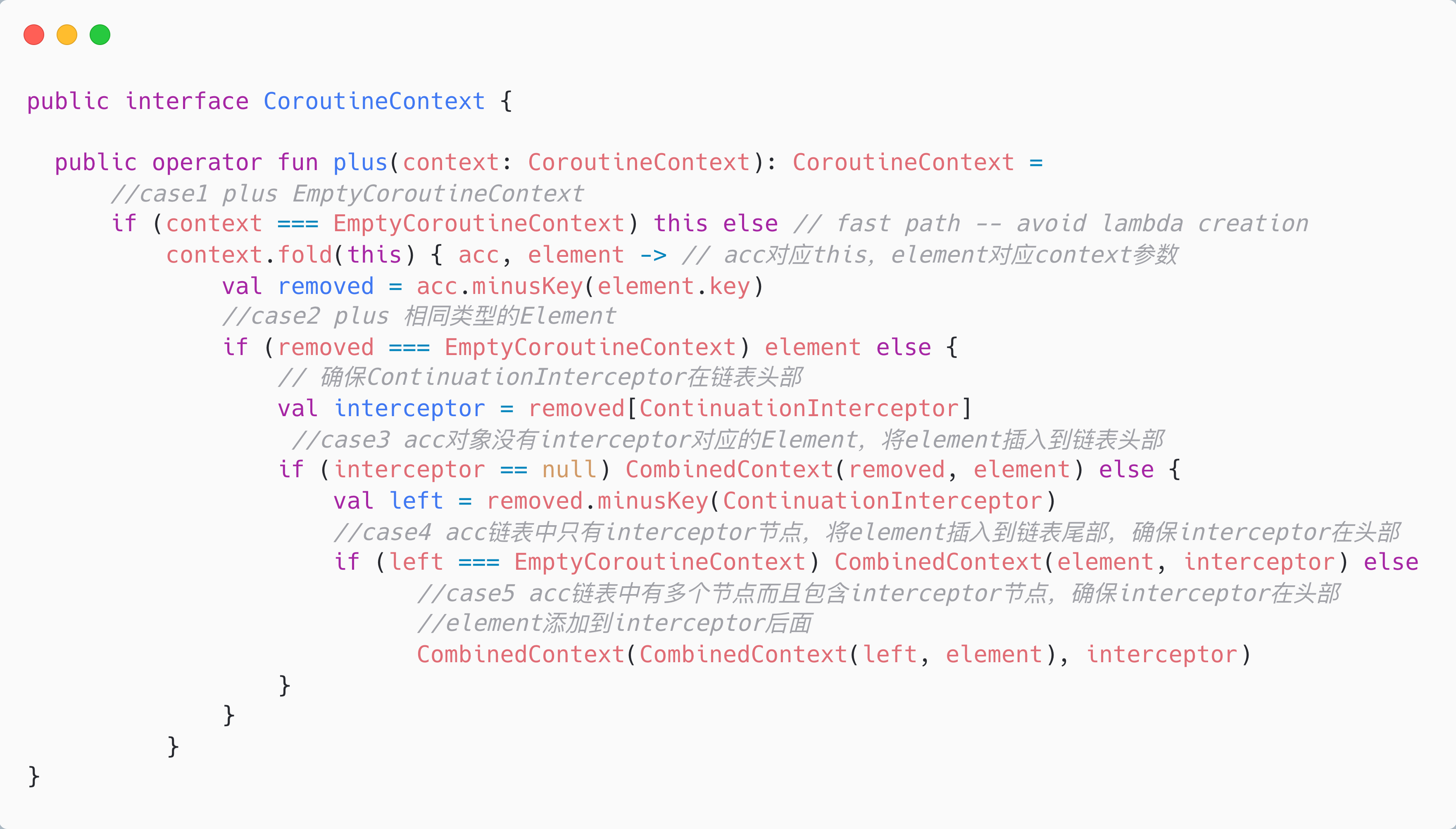 将两个CoroutineContext组合成一个CoroutineContext,如果是两个类型相同的Element会返回一个新的Element。如果是两个不同类型的Element会返回一个CombinedContext。如果是多个不同类型的Element会返回一条CombinedContext链表。