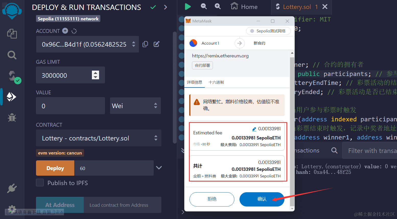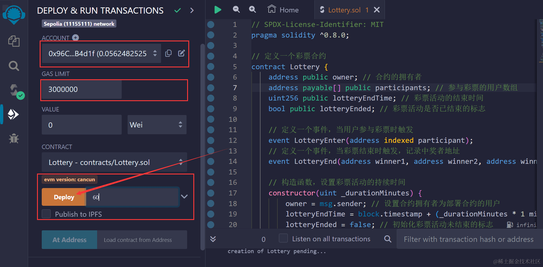 连接成功后,左侧可以看到我们的账户地址、余额,汽油费上限。在Deploy右侧可以看到我们在构造函数中设置的活动持续时间,设置为60min,点击Deploy发布。