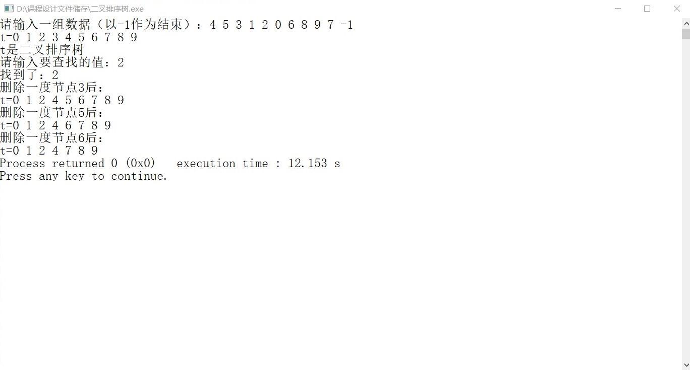 通过本次实验,我学习了排序二叉树的建立、判定二叉树是否为BST、在二叉排序树中查找元素x、打印操作、删除值为x的结点等操作,在实现这些操作的过程中,我认识到自己存在的一些不足之处,在以后的学习中我会加以改正。