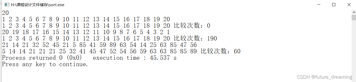 请修改和实现该算法,加入比较次数的计算与结果输出,并分别以 n=20 的三 组数据作为输入(最好情况、一般情况、最坏情况),输出排序结果,并输出比较次数,分析比较次数与不同情况输入以及问题规模 N 的关系
