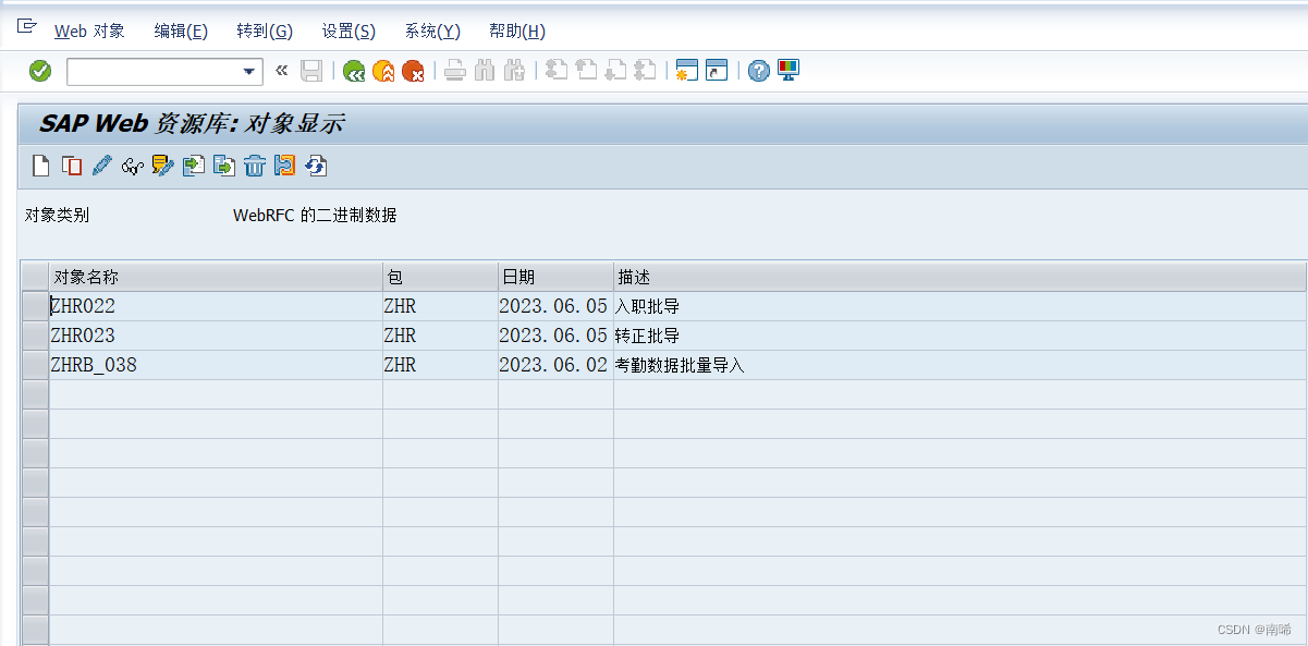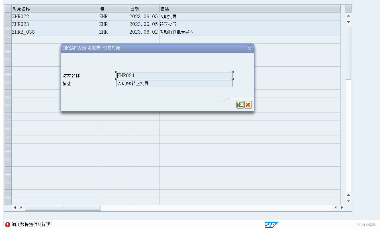如下图在做批导程序时,需要先往sap中上传一个模版文件,使用事务码SMW0,选择二进制文件然后新建一条数据,并且当此excel文件被打开时,创建则会显示调用数据提供商错误,只需要将excel文件关闭即可成功创建.