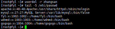 -r:删除用户账号的同时,删除其家目录、邮件池等相关文件。例如userdel -r zhangsan,彻底删除 zhangsan 及其相关文件。