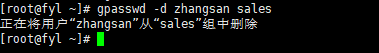 删除成员:gpasswd -d 用户名 组名,将用户从组中移除。如gpasswd -d zhangsan sales,将 zhangsan 从 sales 组中删除。