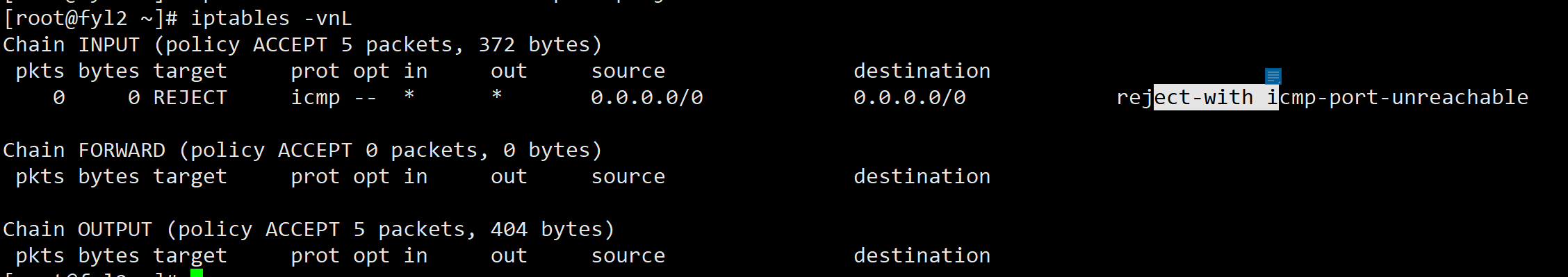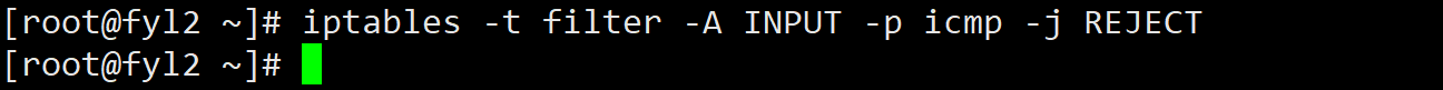 然后我们输入命令:iptables -t filter -A INPUT -p icmp -j REJECT