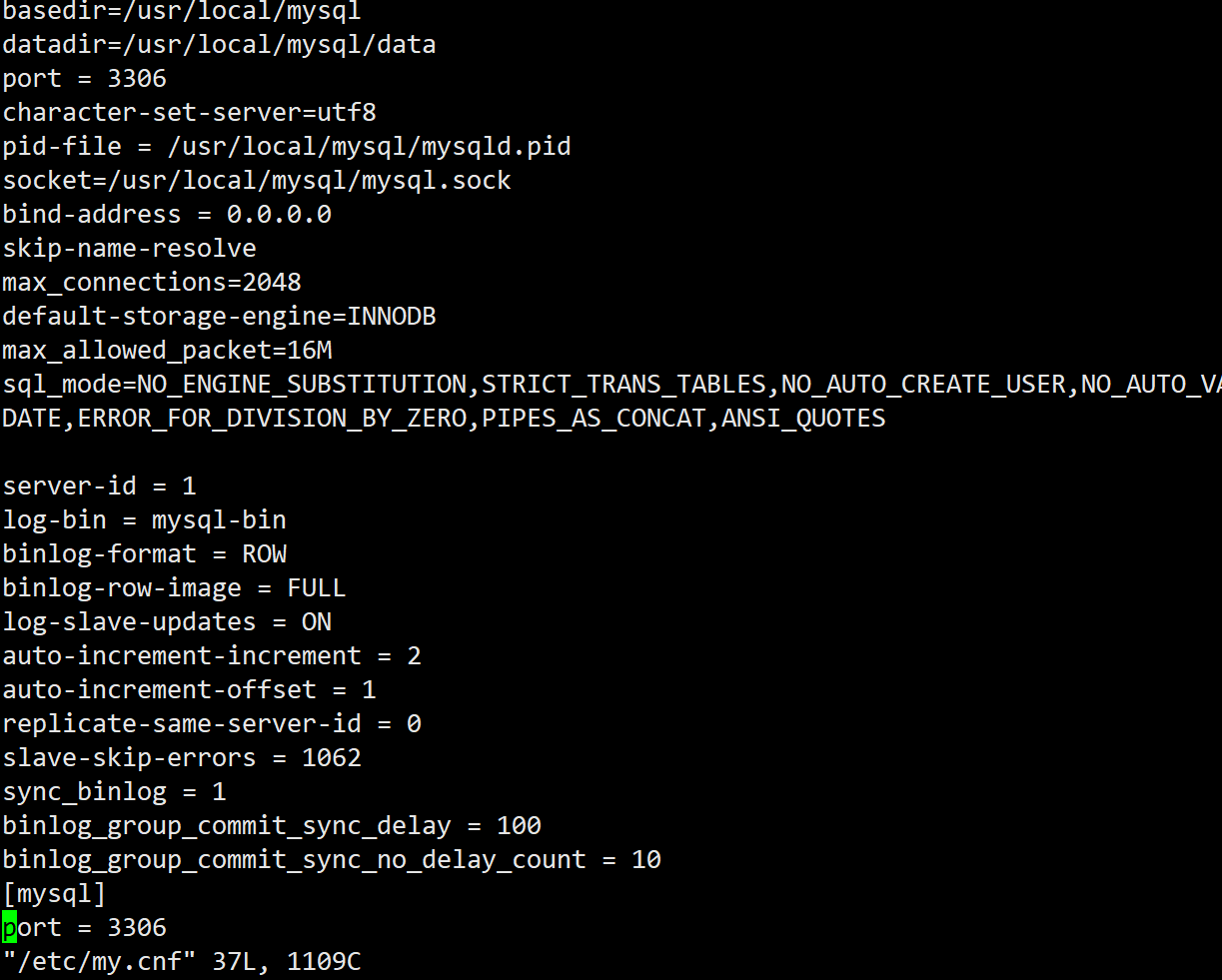 [mysqld] # 现有配置保持不变... user = mysql basedir=/usr/local/mysql datadir=/usr/local/mysql/data port = 3306 character-set-server=utf8 pid-file = /usr/local/mysql/mysqld.pid socket=/usr/local/mysql/mysql.sock bind-address = 0.0.0.0 skip-name-resolve max_connections=2048 default-storage-engine=INNODB max_allowed_packet=16M sql_mode=NO_ENGINE_SUBSTITUTION,STRICT_TRANS_TABLES,NO_AUTO_CREATE_USER,NO_AUTO_VALUE_ON_ZERO,NO_ZERO_IN_DATE,NO_ZERO_DATE,ERROR_FOR_DIVISION_BY_ZERO,PIPES_AS_CONCAT,ANSI_QUOTES # 以下是新增的复制关键参数(双主必需): server-id = 1 # 10.0.0.251 改为 server-id = 2(必须唯一) log-bin = mysql-bin # 启用二进制日志 binlog-format = ROW # 推荐使用ROW格式 binlog-row-image = FULL # 记录完整的行数据 log-slave-updates = ON # 从库也记录binlog(双主必需) auto-increment-increment = 2 # 自增步长(双主设为2) auto-increment-offset = 1 # 10.0.0.251 改为 offset = 2 replicate-same-server-id = 0 # 禁止复制自己的事件 slave-skip-errors = 1062 # 跳过主键冲突错误 sync_binlog = 1 # 每次事务提交都同步binlog(数据安全) binlog_group_commit_sync_delay = 100 # 组提交优化 binlog_group_commit_sync_no_delay_count = 10