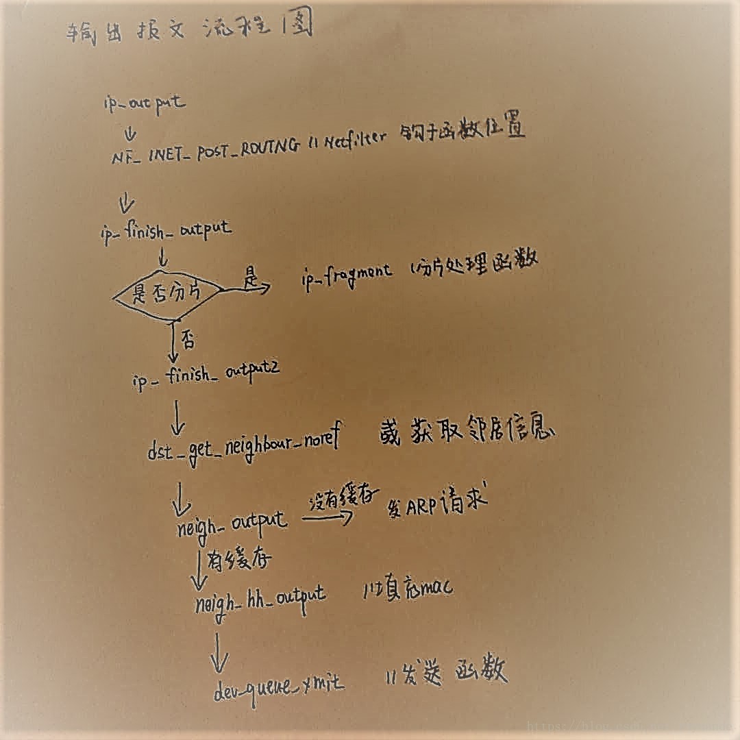 首先,ip_output接收skb后,会先让挂在netfilter post-routing链上的钩子函数处理,我们的抓包钩子也在这里,处理完成后,如果报文还在的话,就传给ip_finish_output处理,这个函数主要就是根据 MTU 判断报文长度是否太长,太长的话就调用ip_fragment函数处理,不管报文是否分片,最终都会调用ip_finish_output2函数。