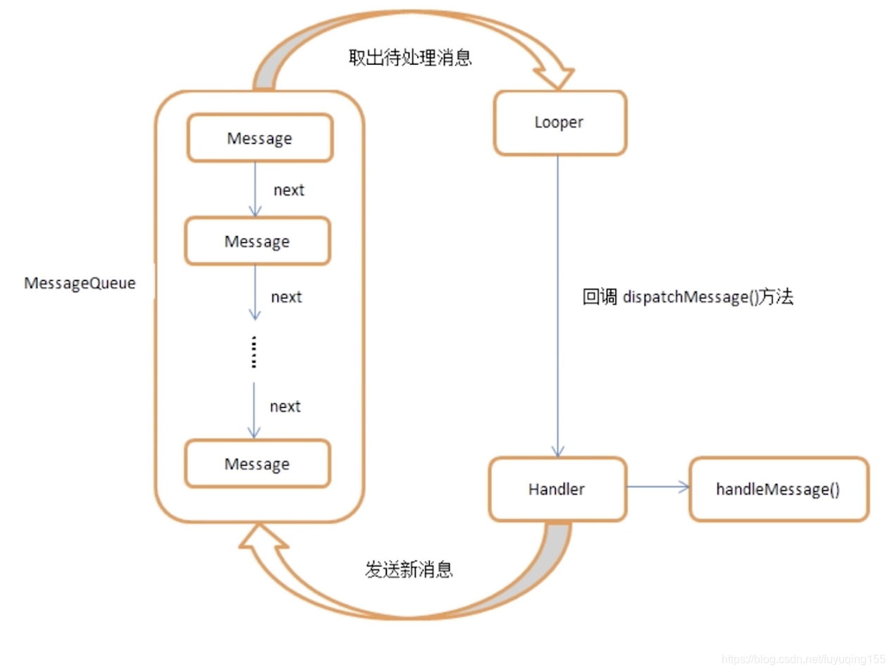 首先在主线程中为主线程创建Looper(Looper为线程持有),同时在Looper内部创建一个消息队列(MessageQueue对象)。当创建Handler时会取出当前线程的Looper,通过这个Looper不断轮询消息队列中的Message。Handler在子线程中发送消息的实质就是在MessageQueue中添加一条Message,最后通过Looper中的消息循环取得Message再交给Handler进行处理。