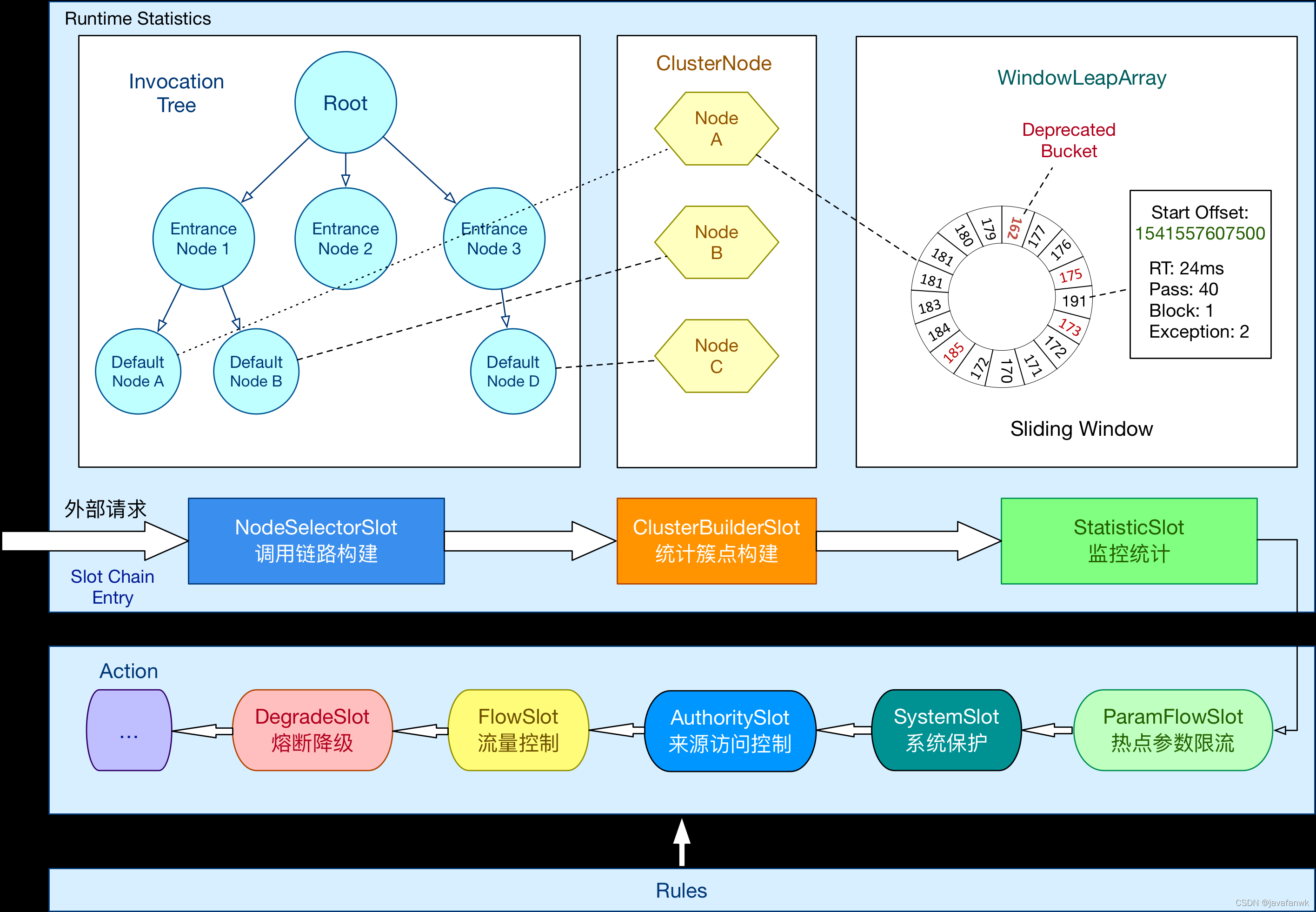 NodeSelectorSlot负责收集资源的路径,并将这些资源的调用路径,以树状结构存储起来,用于根据调用路径来限流降级;ClusterBuilderSlot则用于存储资源的统计信息以及调用者信息,例如该资源的 RT, QPS, thread count 等等,这些信息将用作为多维度限流,降级的依据;StatisticSlot则用于记录、统计不同纬度的 runtime 指标监控信息;FlowSlot则用于根据预设的限流规则以及前面 slot 统计的状态,来进行流量控制;AuthoritySlot则根据配置的黑白名单和调用来源信息,来做黑白名单控制;DegradeSlot则通过统计信息以及预设的规则,来做熔断降级;SystemSlot则通过系统的状态,例如 load1 等,来控制总的入口流量;