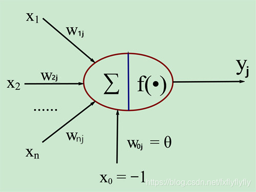 神经元模型接收n个来自其他神经元传递的输出信号,这些输入信号通过带权重的连接进行传递,神经元接受的总输入值将于神经元的阈值进行比较,然后通过激活函数处理,产生神经元的输出。