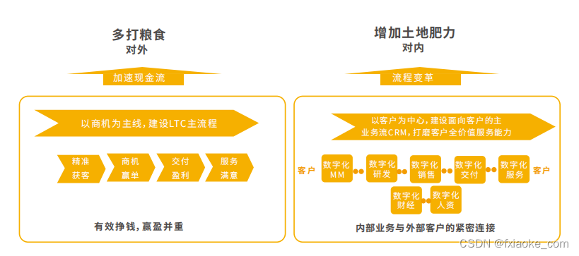 1、面向市场创新的主业务流IPD,旨在打磨产品力,为增长不断提升土地肥力,面向客户的主业务流CRM,旨在打磨客户价值服务能力,为增长提供多打粮食的保障。