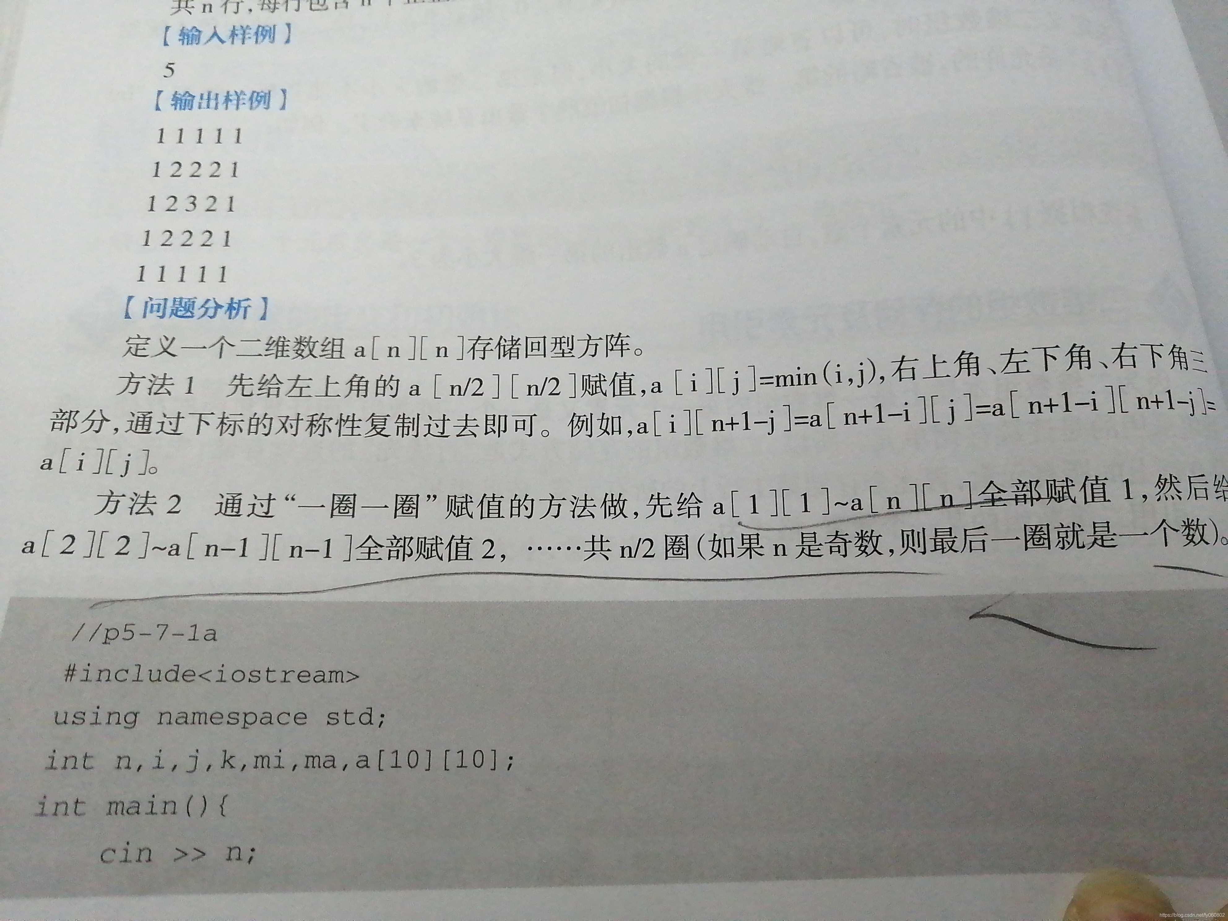 问题描述:输入一个正整数n,输出n*n的回型方阵。例如,n=5时输出: