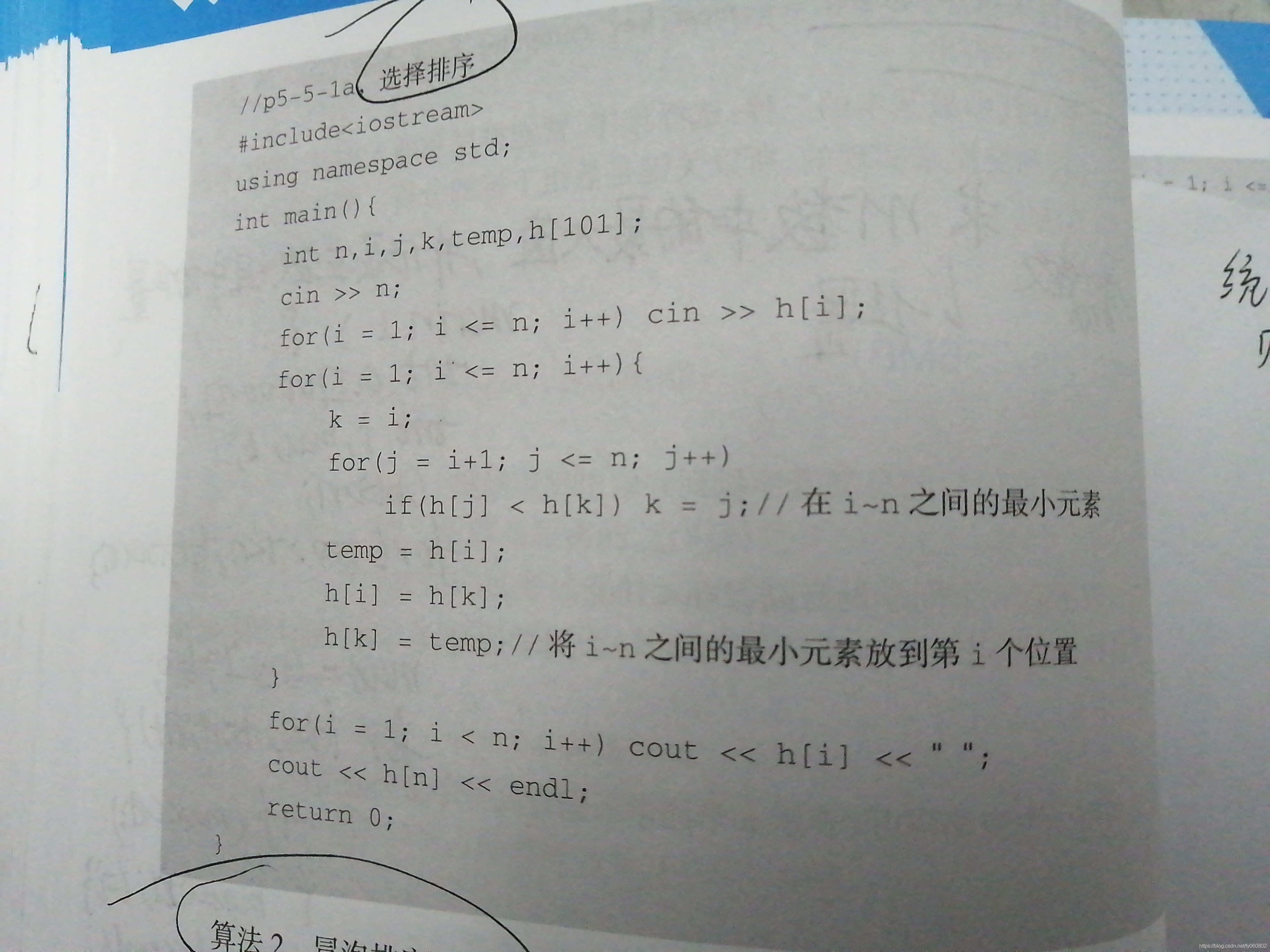 选择排序的基本思想是,每一趟从待排序的数据中,通过打擂台比较出最小元素放在这些数据的最前面,这样第一趟把n个数中第一个到第n个最小的放在第一个位置,第二趟把剩余的n减一个数中,第二个到第n个最小的放在第二个位置,第三套把剩余的n-2个数中,第三个到第n个,最小的放在第三个位置。…第n减一烫,把剩下的两个数中第n减一个到第n个最小的放在第1n减一个位置,剩下的最后一个数第n个一定对大自然落在了第n个位置。