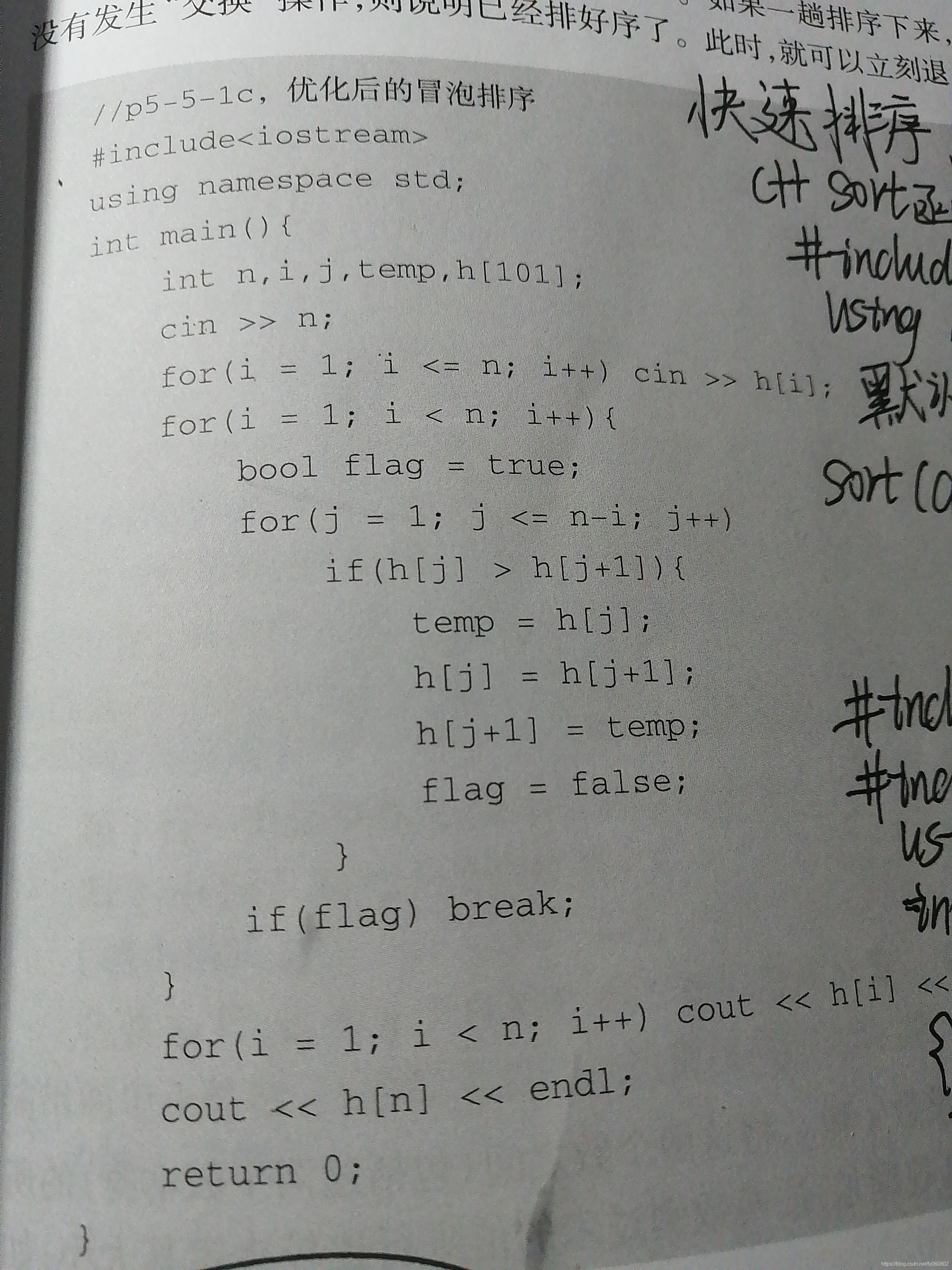 冒泡排序的基本思想是从第一个数开始,依次不断比较相邻的两个元素,如果逆序就交换这样一套排序结束后最大的元素就放在了第n个位置