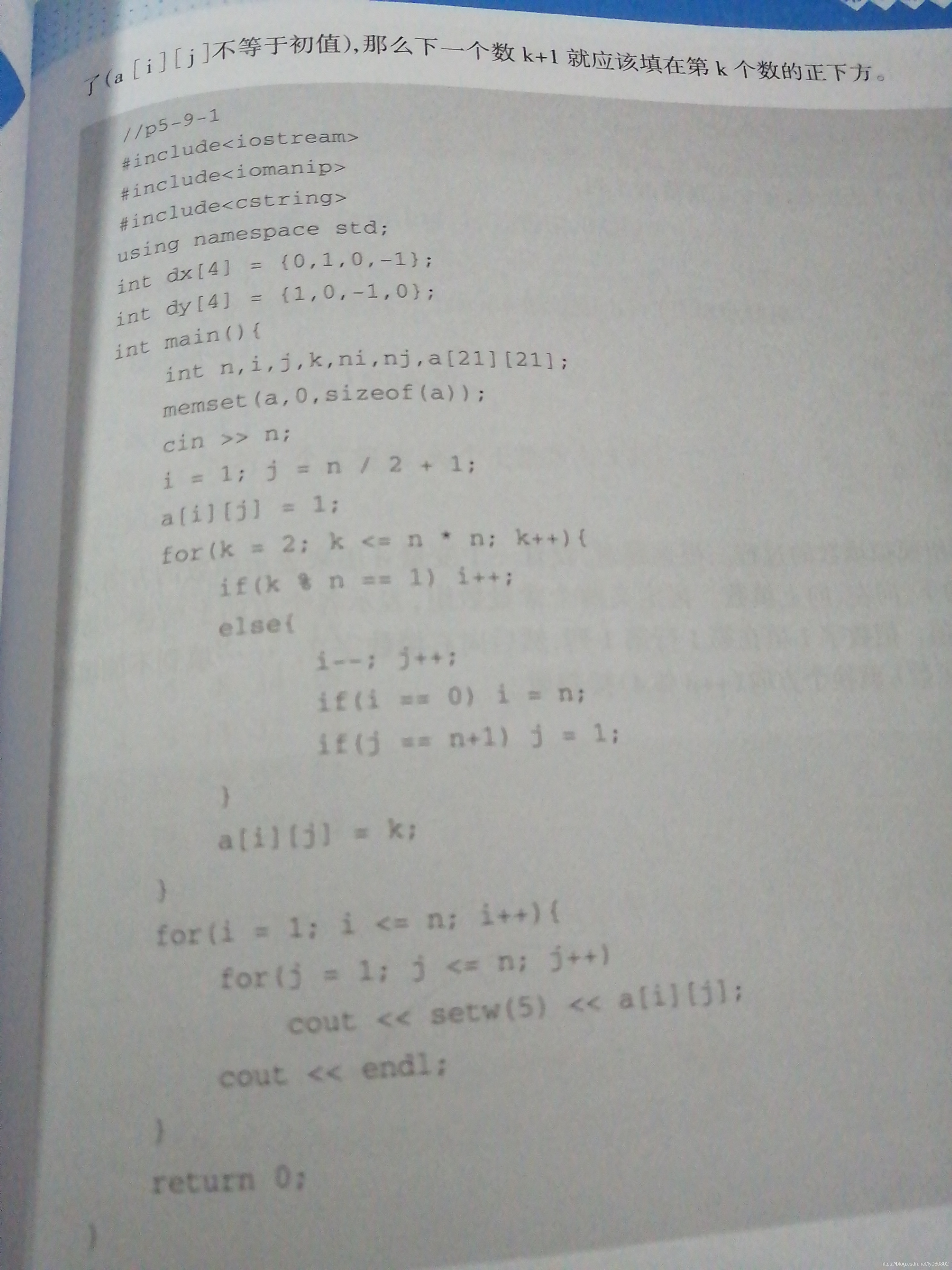 模拟法就是把数字方阵看成一个动态的填数过程吧,n*n的个数依次填入数组中,每填好一个数就定位好,下一个数的位置ii和j