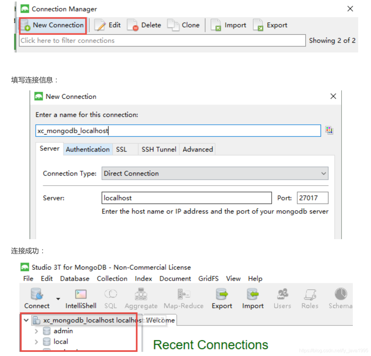 mongodb://root:root@localhost 使用用户名root密码为root连接本地数据库27017端口 mongodb://localhost,localhost:27018,localhost:27019,连接三台主从服务器,端口为27017、27018、27019