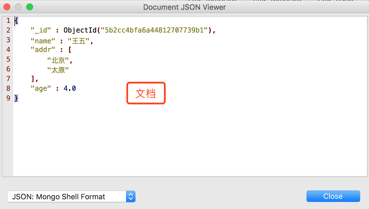 mongodb中文档的格式是json格式,下边就是一个文档,包括两个key:_id主键和name