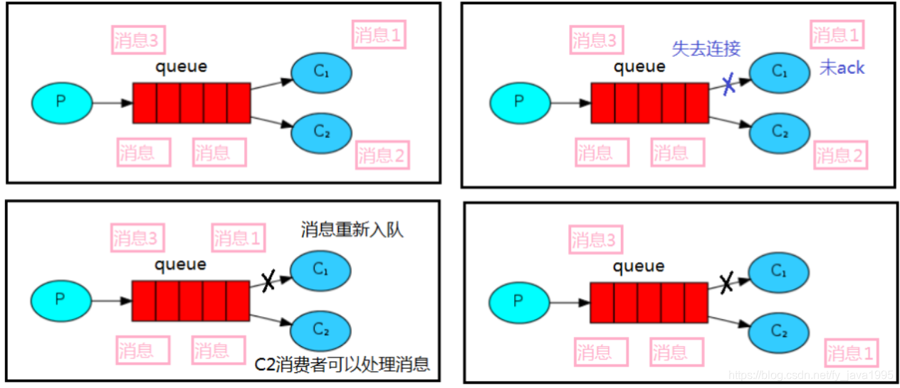 如果消费者由于某些原因失去连接(其通道已关闭,连接已关闭或 TCP 连接丢失),导致消息 未发送 ACK 确认,RabbitMQ 将了解到消息未完全处理,并将对其重新排队。如果此时其他消费者可以处理,它将很快将其重新分发给另一个消费者。这样,即使某个消费者偶尔死亡,也可以确保不会丢失任何消息。