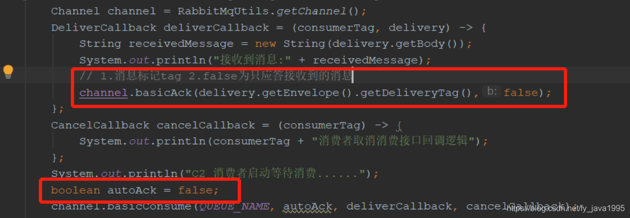 默认消息采用的是自动应答,所以我们要想实现消息消费过程中不丢失,需要把自动应答改 为手动应答,消费者在上面代码的基础上增加下面代码。