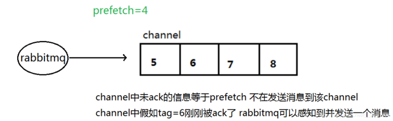 本身消息的发送就是异步发送的,所以在任何时候,channel 上肯定不止只有一个消息另外来自消费者的手动确认本质上也是异步的。因此这里就存在一个未确认的消息缓冲区,因此希望开发人员能限制此缓冲区的大小,以避免缓冲区里面无限制的未确认消息问题。这个时候就可以通过使用 basic.qos 方法设置“预取计数”值来完成的。该值定义通道上允许的未确认消息的最大数量。一旦数量达到配置的数量, RabbitMQ 将停止在通道上传递更多消息,除非至少有一个未处理的消息被确认,例如,假设在通道上有未确认的消息 5、6、7,8,并且通道的预取计数设置为 4,此时 RabbitMQ 将不会在该通道上再传递任何消息,除非至少有一个未应答的消息被 ack。比方说 tag=6 这个消息刚刚被确认 ACK,RabbitMQ 将会感知这个情况到并再发送一条消息。消息应答和 QoS 预取值对用户吞吐量有重大影响。通常,增加预取将提高向消费者传递消息的速度。虽然自动应答传输消息速率是最佳的,但是,在这种情况下已传递但尚未处理的消息的数量也会增加,从而增加了消费者的 RAM 消耗(随机存取存储器)应该小心使用具有无限预处理的自动确认模式或手动确认模式,消费者消费了大量的消息如果没有确认的话,会导致消费者连接节点的内存消耗变大,所以找到合适的预取值是一个反复试验的过程,不同的负载该值取值也不同 100 到 300 范 围内的值通常可提供最佳的吞吐量,并且不会给消费者带来太大的风险。预取值为 1 是最保守的。当然这将使吞吐量变得很低,特别是消费者连接延迟很严重的情况下,特别是在消费者连接等待时间较长的环境中。对于大多数应用来说,稍微高一点的值将是最佳的。