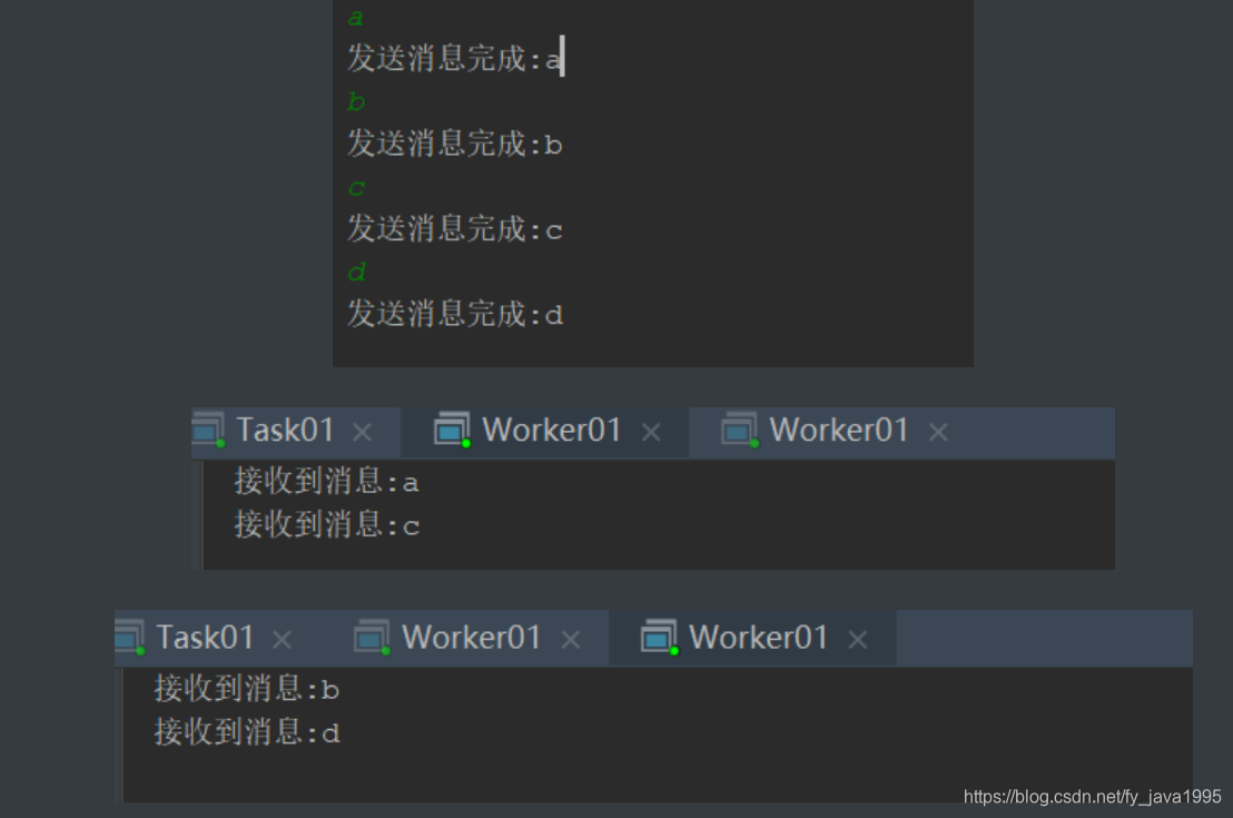 在这个案例中我们会启动两个工作线程,一个消息发送线程,我们来看看它们两个工作线程是如何工作的。