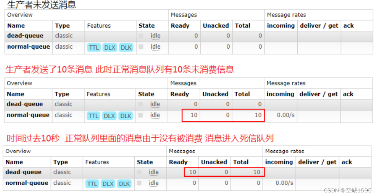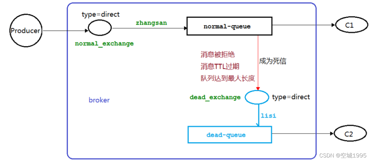 先从概念解释上搞清楚这个定义,死信,顾名思义就是无法被消费的消息,字面意思可以这样理解,一般来说,producer 将消息投递到 broker 或者直接到 queue 里了,consumer 从 queue 取出消息进行消费,但某些时候由于特定的原因导致 queue 中的某些消息无法被消费,这样的消息如果没有后续的处理,就变成了死信,有死信自然就有了死信队列。