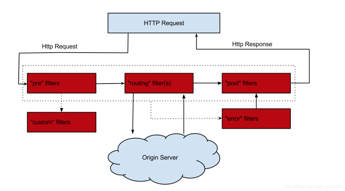 Filter是Zuul的核心,用来实现对外服务的控制。Filter的生命周期有4个,分别是“PRE”、“ROUTING”、“POST”、“ERROR”,整个生命周期可以用下图来表示。