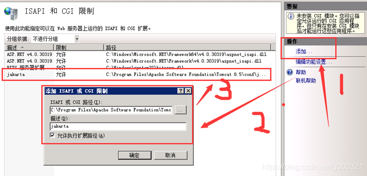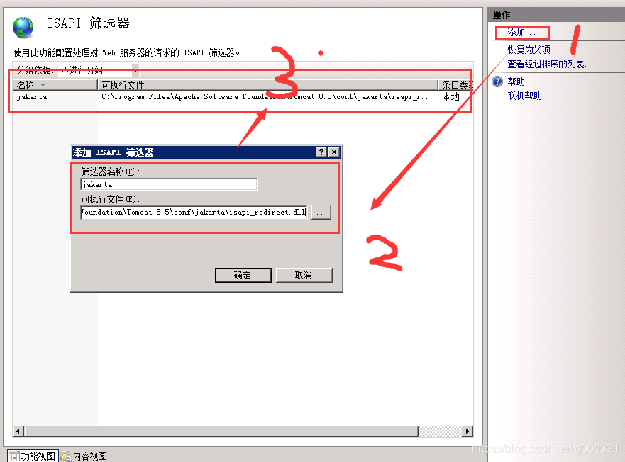 筛选器名字必须是jakarta,可执行文件是我们刚才isapi_redirect.dll,填写完毕后确认,就会有第三步显示的内容。