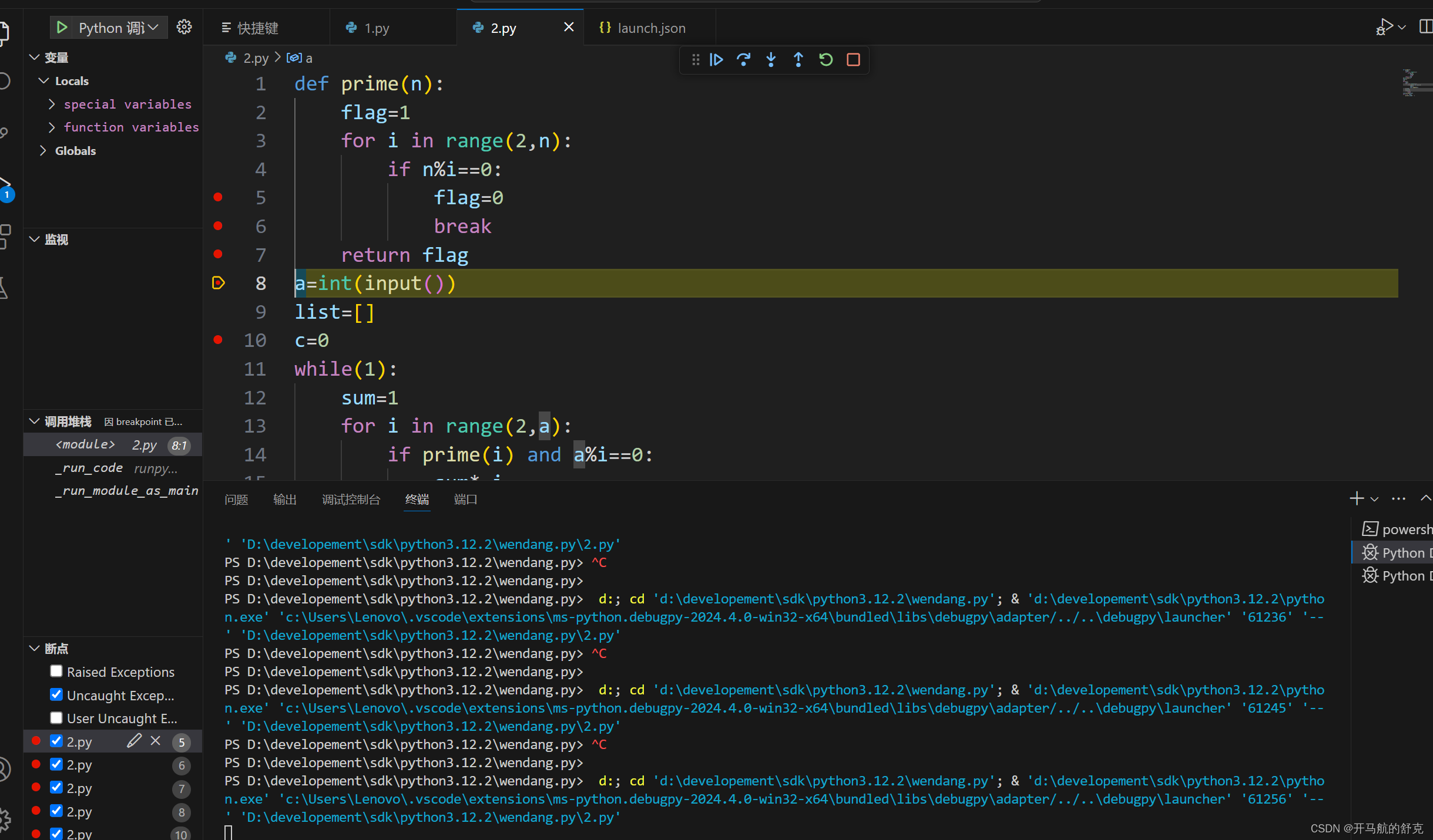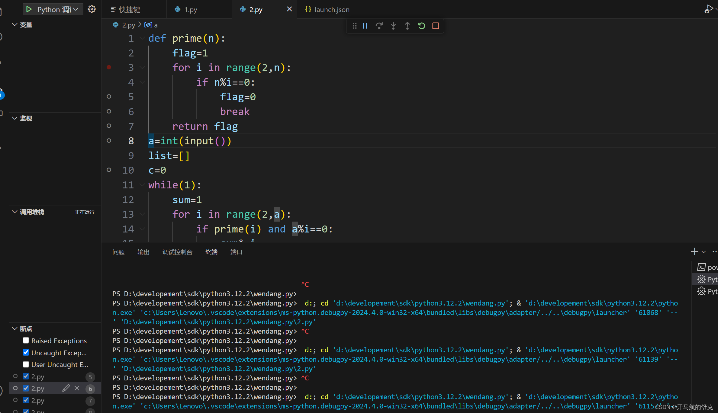 博客指出Python运行后左边变量不显示、顶上快捷键无法使用的问题,给出解决办法,即点击旁边设置打开launch.json文件,输入代码“justMyCode”: false, 即可解决。