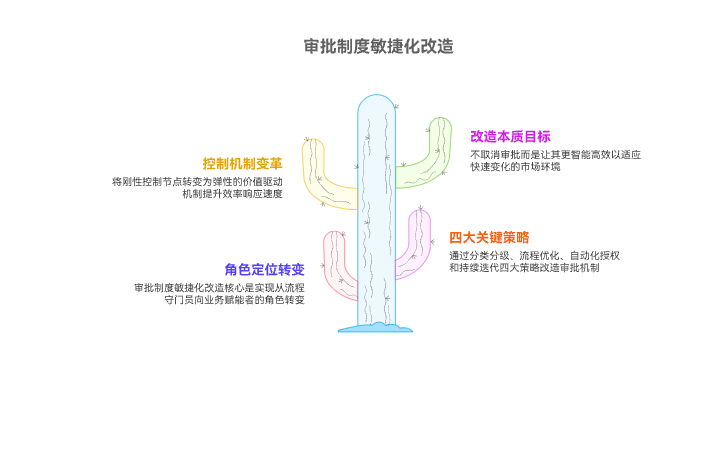 审批制度的敏捷化改造,其核心是实现从“流程守门员”向“业务赋能者”的角色转变。这套改造的关键在于通过“分类分级”、“流程优化”、“自动化授权”和“持续迭代”四大策略,将刚性的控制节点转变为弹性的价值驱动机制,在有效控制风险的前提下,最大化地提升组织的决策效率和业务响应速度。 这不是要彻底取消审批,而是要让审批变得更智能、更高效,使其适应快速变化的市场环境。