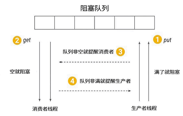 如代码所示,首先,创建了一个 ArrayBlockingQueue 类型的 BlockingQueue,命名为 queue 并将它的容量设置为 10;其次,创建一个简单的生产者,while(true) 循环体中的queue.put() 负责往队列添加数据;然后,创建两个生产者线程并启动;同样消费者也非常简单,while(true) 循环体中的 queue.take() 负责消费数据,同时创建两个消费者线程并启动。为了代码简洁并突出设计思想,代码里省略了 try/catch 检测,我们不纠结一些语法细节。以上便是利用 BlockingQueue 实现生产者消费者模式的代码。虽然代码非常简单,但实际上 ArrayBlockingQueue 已经在背后完成了很多工作,比如队列满了就去阻塞生产者线程,队列有空就去唤醒生产者线程等。