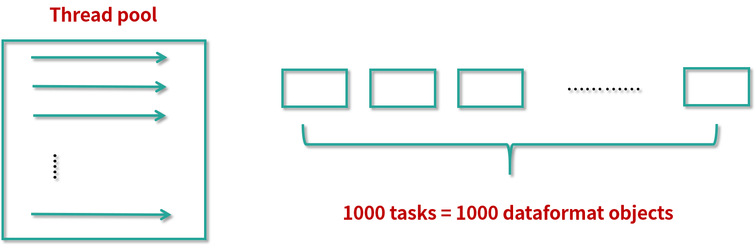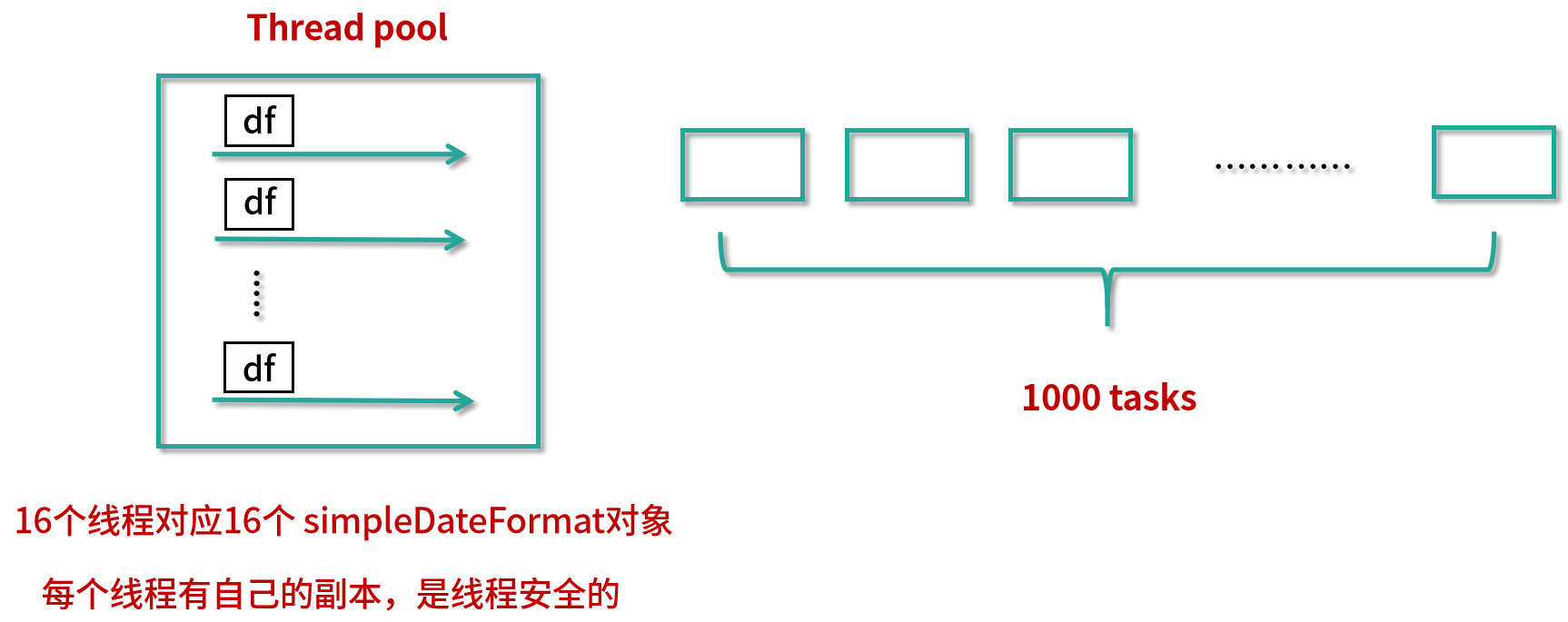 在图中的左侧可以看到,这个线程池一共有 16 个线程,对应 16 个 simpleDateFormat 对象。而在这个图画的右侧是 1000 个任务,任务是非常多的,和原来一样有 1000 个任务。但是这里最大的变化就是,虽然任务有 1000 个,但是我们不再需要去创建 1000 个 simpleDateFormat 对象了。即便任务再多,最终也只会有和线程数相同的 simpleDateFormat 对象。这样既高效地使用了内存,又同时保证了线程安全。