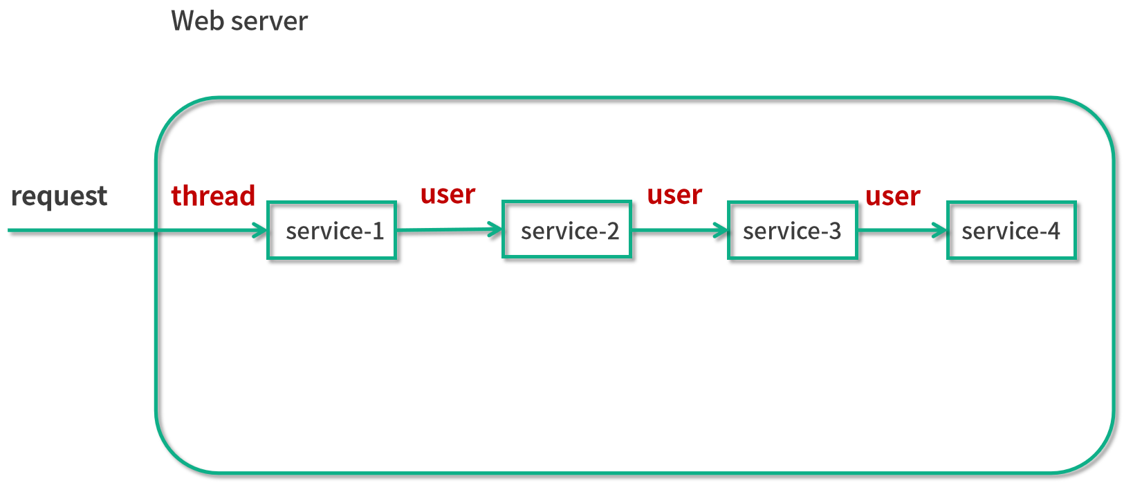 在 service-1() 的时候它会创建一个 user 的对象,用于保存比如说这个用户的用户名等信息,后面 service-2/3/4() 都需要用到这个对象的信息,比如说 service-2() 代表下订单、service-3() 代表发货、service-4() 代表完结订单,在这种情况下,每一个方法都需要用户信息,所以就需要把这个 user 对象层层传递下去,从 service-1() 传到 service-2(),再从 service-2() 传到 service-3(),以此类推。