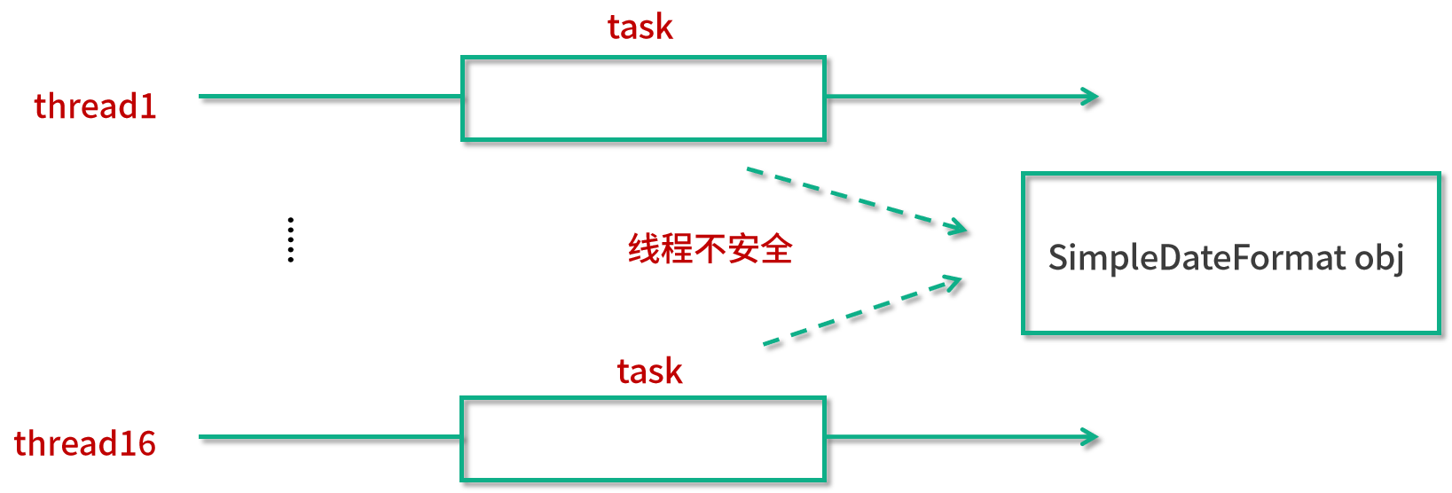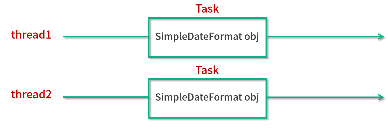 从图中可以看出,我们有不同的线程,并且线程会执行它们的任务。但是不同的任务所调用的 simpleDateFormat 对象都是同一个,所以它们所指向的那个对象都是同一个,但是这样一来就会有线程不安全的问题。