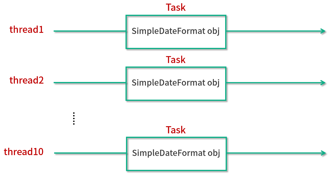 假设我们的需求有了升级,不仅仅需要 2 个线程,而是需要 10 个,也就是说,有 10 个线程同时对应 10 个 SimpleDateFormat 对象。我们就来看下面这种写法: