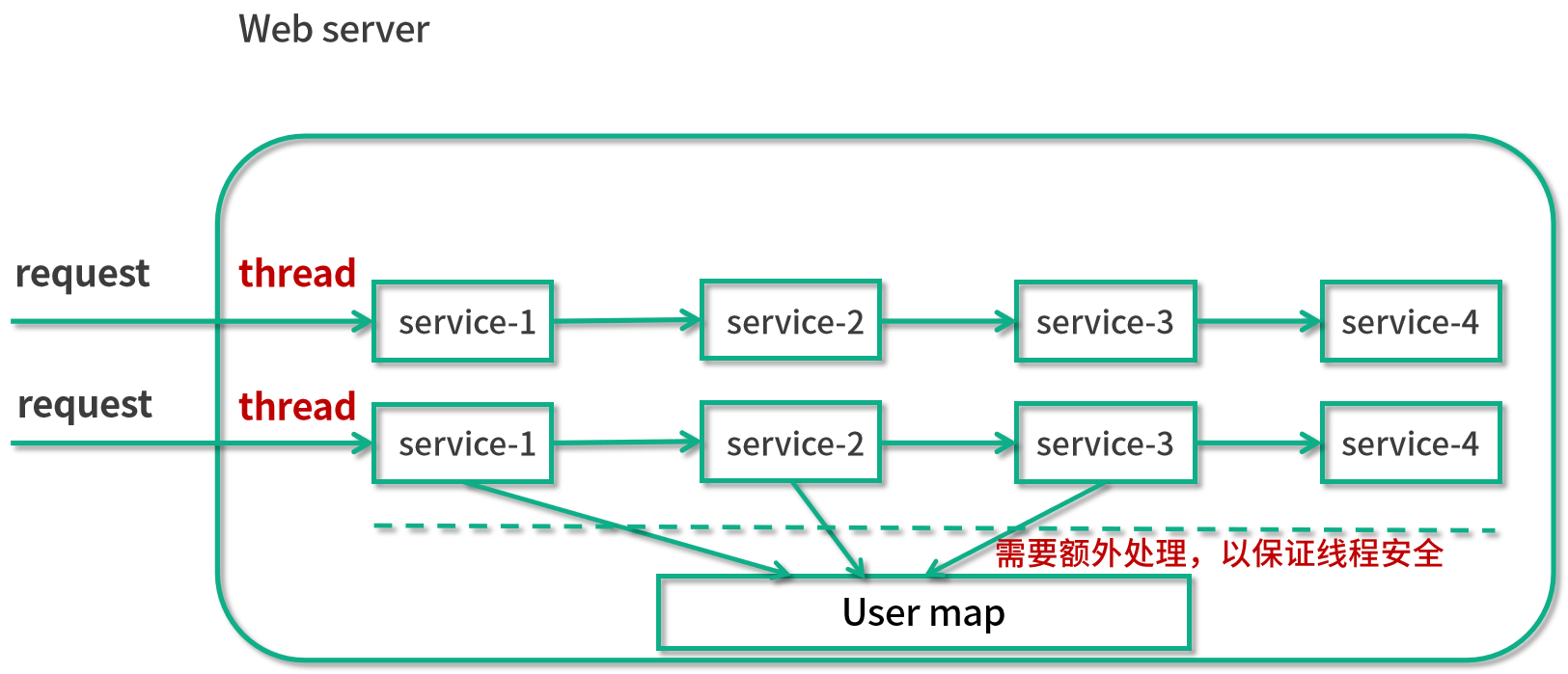 在这个图中,可以看出有两个线程,并且每个线程所做的事情都是访问 service-1/2/3/4()。那么当它们同时运行的时候,都会同时访问这个 User map,于是就需要 User map 是线程安全的。