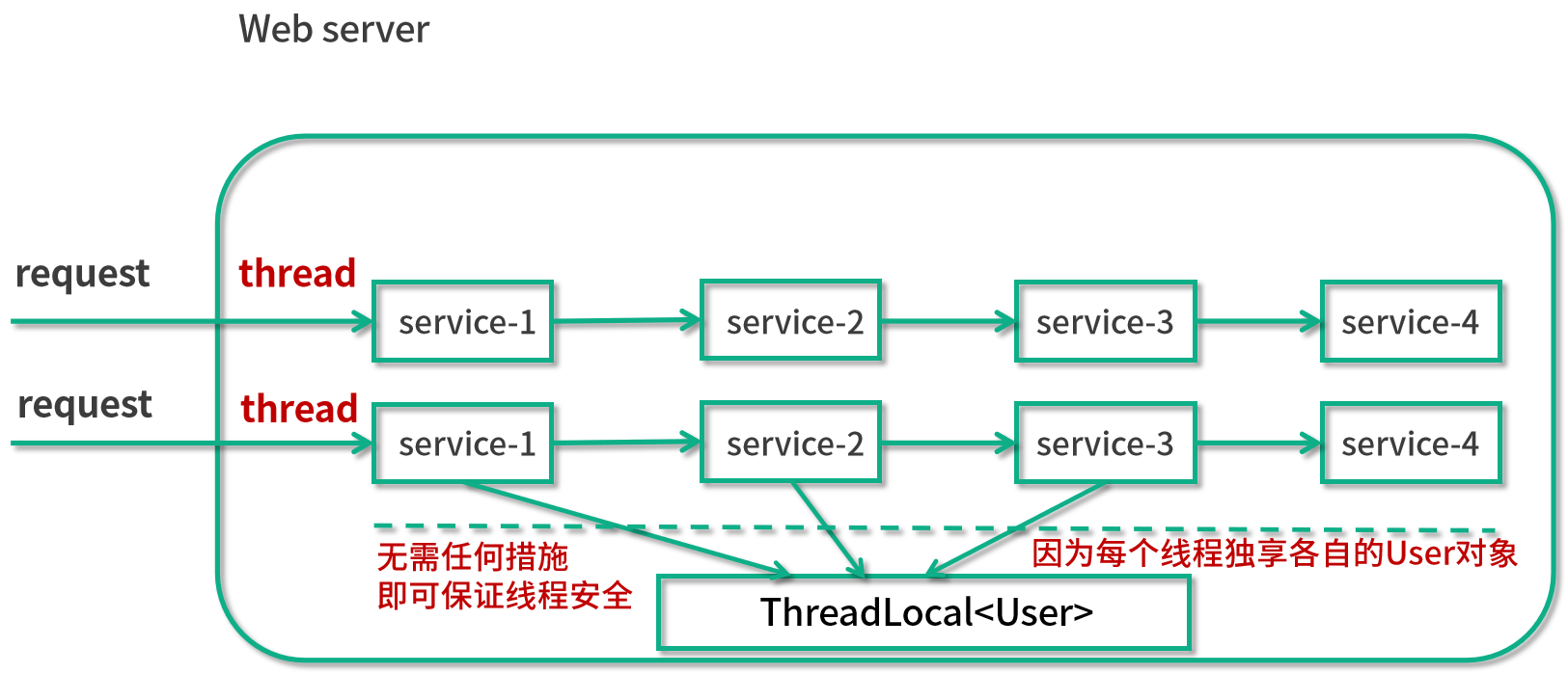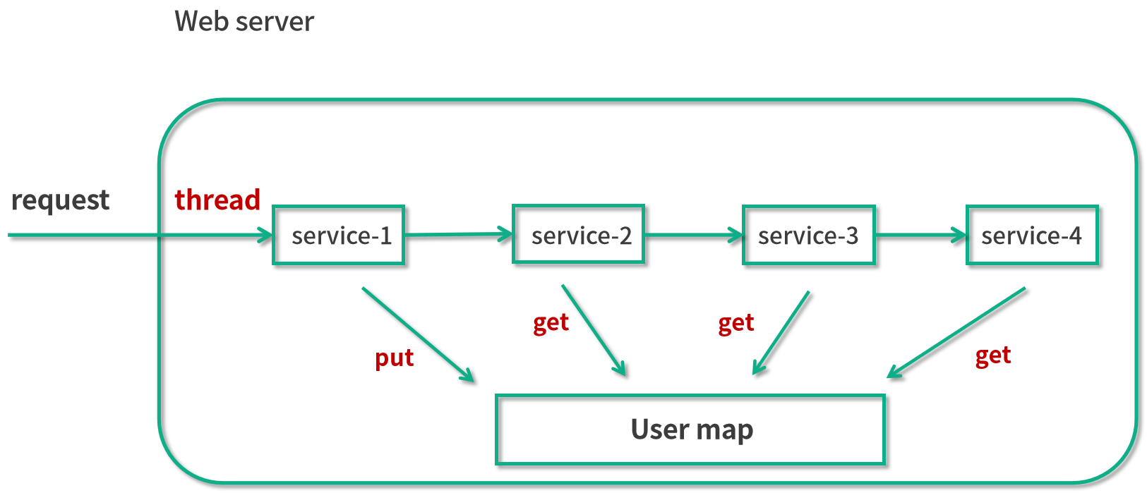 比如说我们使用了这样的 Map 之后,就不需要把 user 对象层层传递了,而是在执行 service-1() 的时候,把这个用户信息给 put 进去,然后后面需要拿用户信息的时候,直接从静态的 User map 里面 get 就可以了。这样一来,无论你执行哪个方法,都可以直接获取到这个用户信息。当然,我们也要考虑到 web 服务器通常都是多线程的,当多个线程同时工作的时候,我们也需要保证线程安全。