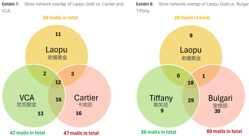 在高端商场布局上,老铺黄金门店全部位于一线和新一线城市的头部商业中心。摩根士丹利研究表明,其门店网络与卡地亚、梵克雅宝等品牌高度重叠,比如约32%的卡地亚中国门店与老铺直接竞争,而同场竞技的结果是,老铺黄金在2024年的单个商场平均收入超越了所有国际珠宝品牌;2025年,单个商场的平均收入更是接近5亿,甚至超越了部分国际一线奢侈品牌。