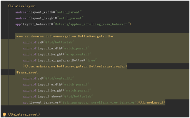 BottomNavigationBar先放在前面然后在FrameLayout中使用layout_above 是表示:先固定好BottomNavigationBar的位置,然后将FrameLayout放在其上面;