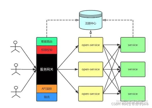 引入服务网关后的微服务架构如上,总体包含三部分:服务网关、open-service和service。